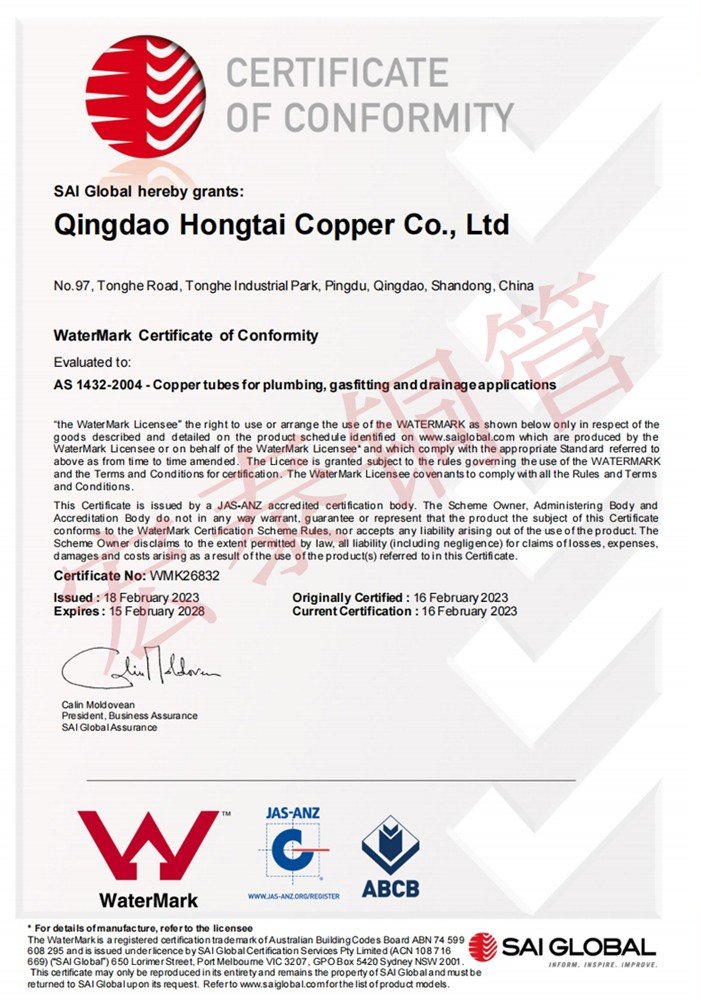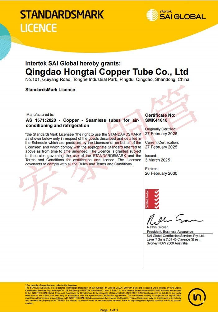 宏泰銅管產(chǎn)品順利通過(guò)AS 1571無(wú)縫制冷用銅管標(biāo)準(zhǔn)認(rèn)證【證書(shū)編號(hào):SMK41618】和AS 1432給排水銅管標(biāo)準(zhǔn)認(rèn)證【證書(shū)編號(hào):WMK26832】。