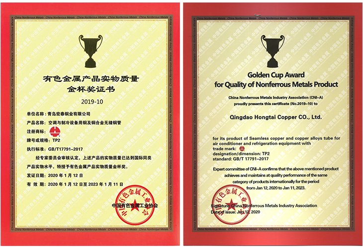 2019年10月至12月,中國有色金屬工業(yè)協(xié)會專家委員會對青島宏泰銅業(yè)有限公司申報(bào)的空調(diào)與制冷設(shè)備用銅及銅合金無縫管進(jìn)行實(shí)地審核和答疑。經(jīng)專家委員會審核認(rèn)定:青島宏泰銅業(yè)有限公司申報(bào)的空調(diào)與制冷設(shè)備用銅及銅合金無縫管的實(shí)物質(zhì)量達(dá)到了國際同類產(chǎn)品實(shí)物質(zhì)量,特授予有色金屬產(chǎn)品實(shí)物質(zhì)量金杯獎。