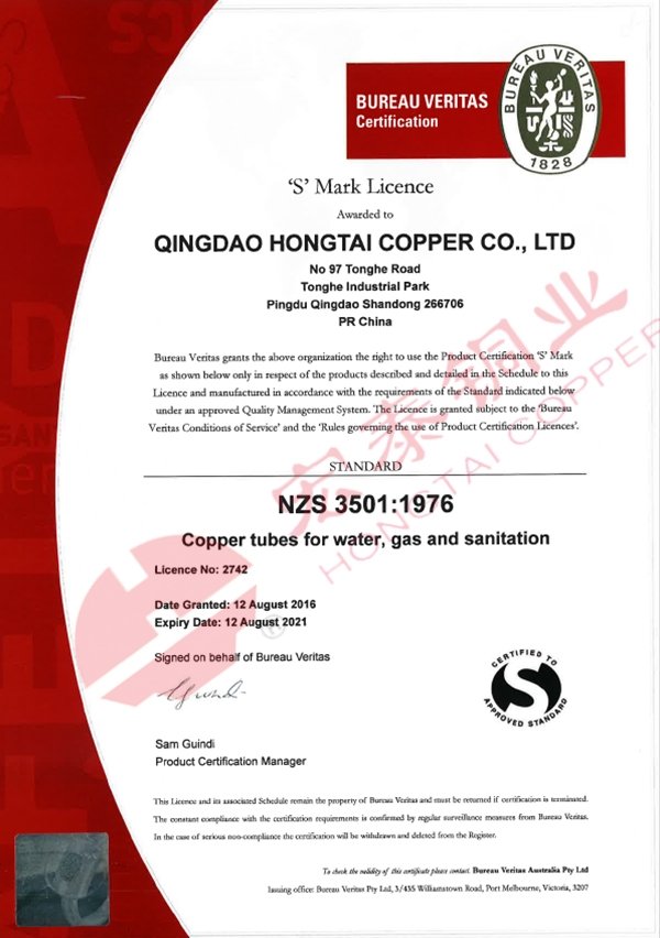 近日宏泰接到國際知名認(rèn)證機(jī)構(gòu)必維國際檢驗集團(tuán)(Bureau Veritas)通知,宏泰銅管產(chǎn)品再次通過NZS 3501水汽衛(wèi)生用銅管標(biāo)準(zhǔn)認(rèn)證【證書編號:2742】、AS/NZS 1571無縫制冷用銅管標(biāo)準(zhǔn)認(rèn)證【證書編號:2743】和AS 1432 給排水銅管標(biāo)準(zhǔn)認(rèn)證【證書編號:23264】。此三項認(rèn)證是宏泰在2004年首次通過上述認(rèn)證后與標(biāo)準(zhǔn)體系的同步更新認(rèn)證。
